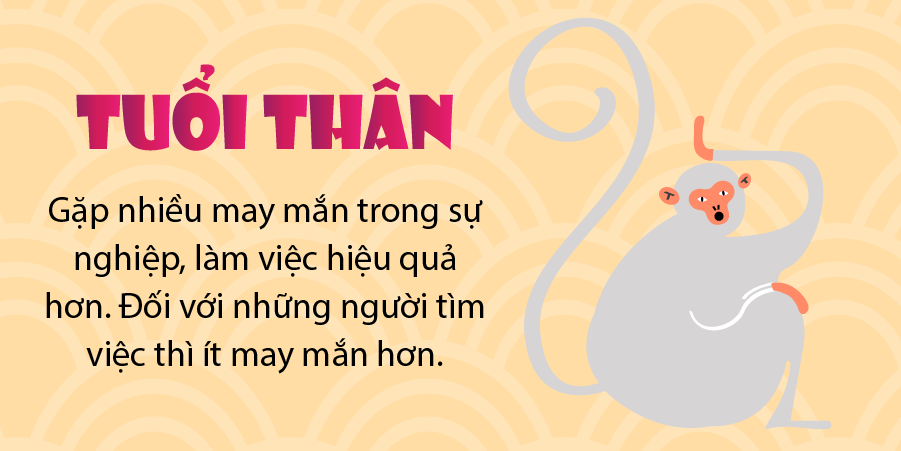 Trong năm nay, các doanh nhân tuổi Thân sẽ có một khởi đầu tốt và hầu hết bạn có thể có được một vị trí trong ngành với sự cạnh tranh khốc liệt nhờ vào đầu óc kinh doanh nhanh nhẹn của bạn. Đồng thời, bạn sẽ được nhiều người ủng hộ để giúp cho con đường khởi nghiệp của bạn trở nên suôn sẻ hơn. Đối với những người làm công ăn lương, bạn sẽ gặp may mắn trong sự nghiệp, làm việc một cách hiệu quả hơn và giành được sự công nhận của sếp với thành tích cá nhân xuất sắc. Đối với những người săn việc làm, bạn sẽ gặp may mắn ở mức trung bình cho sự nghiệp và sự khó khăn do môi trường mới mang lại có thể khiến bạn không thể làm việc trong trạng thái rất tốt. Do đó, hãy suy nghĩ kỹ trước khi bạn đưa ra quyết định về nhảy việc, tham khảo ý kiến của những người đi trước và chọn một công việc phù hợp nhất.