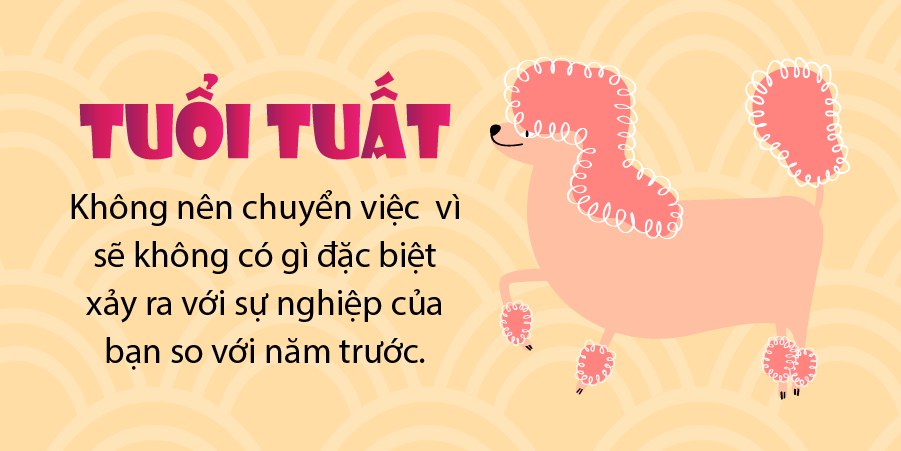 So với năm ngoái, sẽ không có gì đặc biệt xảy ra với sự nghiệp của bạn, vì vậy đừng có chuyển đổi công việc. Do đó, bạn nên làm việc tốt hơn ở vị trí hiện tại và điều quan trọng nhất là làm tốt công việc trước mắt - chỉ bằng cách này bạn mới có thể tìm kiếm một công việc tốt hơn. Mỗi tuổi Tuất đều có ngày - bạn sẽ không gặp xui xẻo trong sự nghiệp; một ngày nào đó, bạn sẽ gặp may mắn.